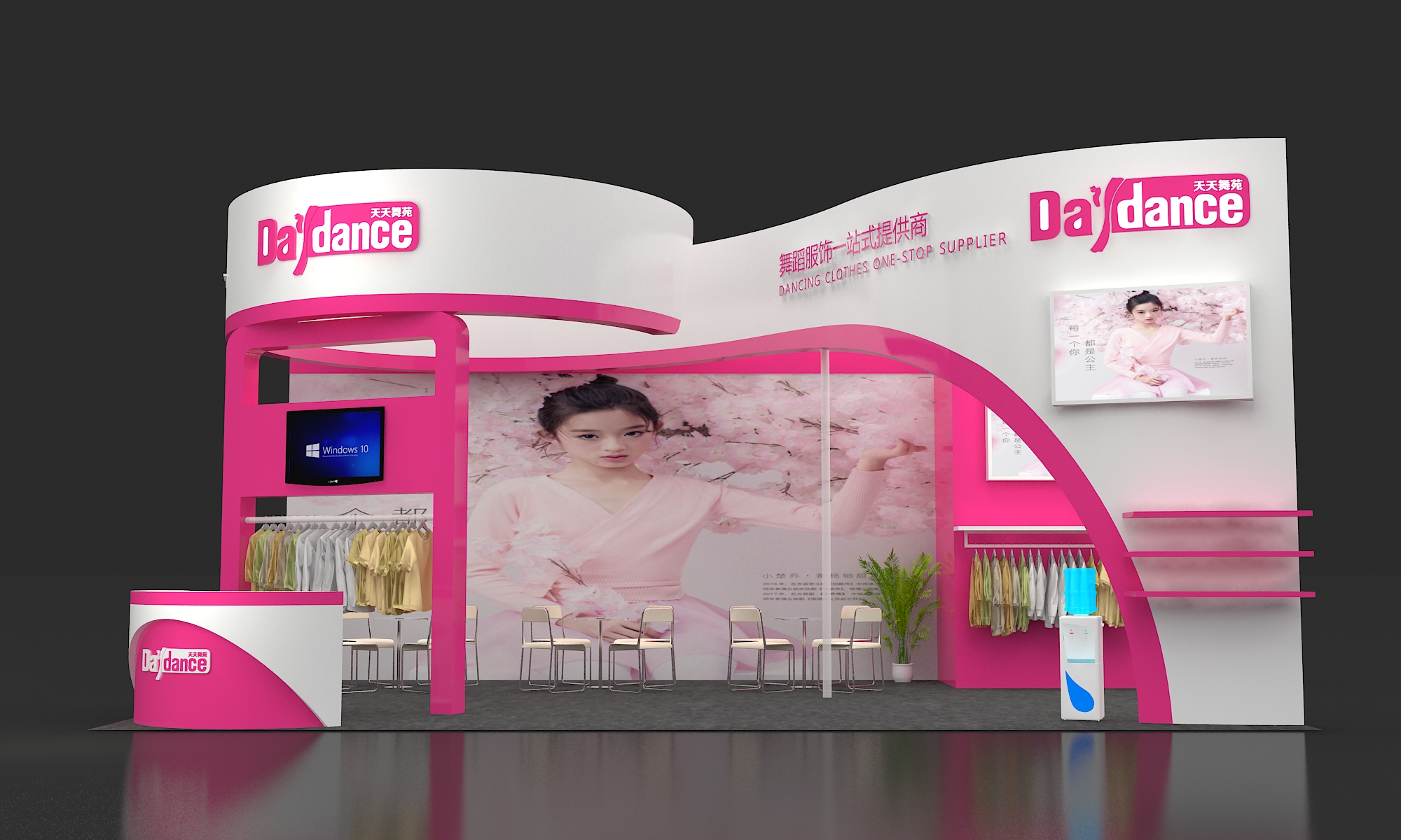 第二點,嚴格控制顏色運用,通常主色調(diào)只使用1種,輔助色最多不超2種。輔助色要盡量用于展臺整體線條輪廓的勾勒。
